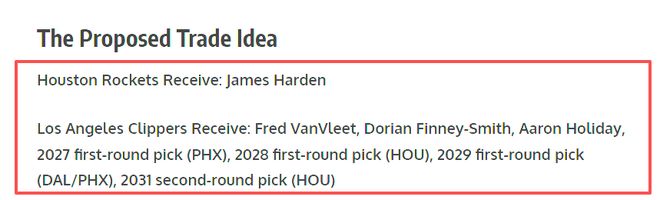 快船得到:范弗利特、芬尼史密斯、霍乐迪、太阳2027年首轮签,火箭的2028年首轮选秀权、2029年首轮选秀权(太阳和独行侠首轮更靠前的那一个首轮签)、2031年次轮选秀权